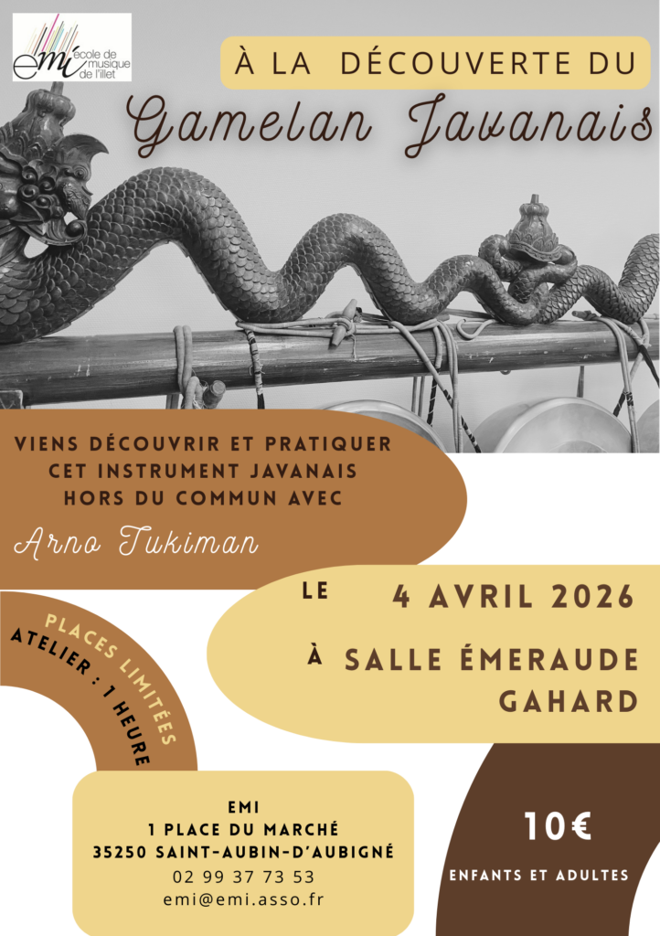 L’école de musique propose un atelier de découverte du Gamelan avec Arno Tukiman, un musicien professionnel spécialisé dans le gamelan indonésien, le samedi 04 avril 2026 à la salle Emeraude de Gahard.