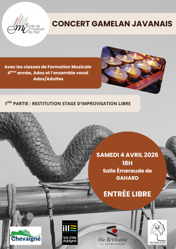 Le samedi 04 avril, les élèves des classes de formation musicale de 4ème année et ados présenteront leur projet d’année sur « le Gamelan Javanais » à 18h à la salle Emeraude de Gahard. Le concert est ouvert à tous.